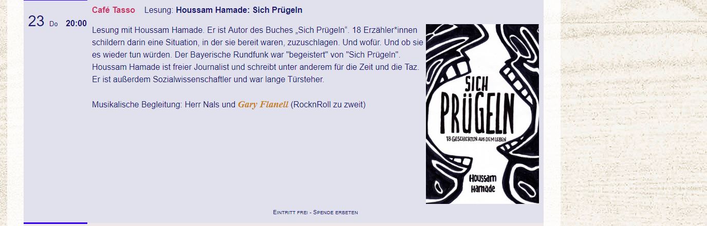 Am Donnerstag, den 23ten Mai lese ich aus Sich Prügeln im Café Tasso. Herr Nals und Gary Flanell machen dazu Rock&Roll zu Zweit. Das ist alles sehr unterhaltsam und tief. Kommt also. Viele Lesungen mache ich nicht mehr, zumindest nicht mit Sich Prügeln.